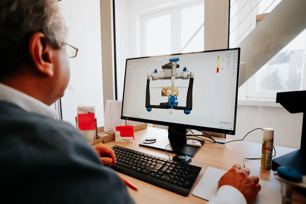 Mit moderner Software entwickeln wir Zahnersatzlösungen, die individuell auf Anatomie und Bedürfnisse abgestimmt sind – von individuellen Abutments bis zu Stegprothesen.