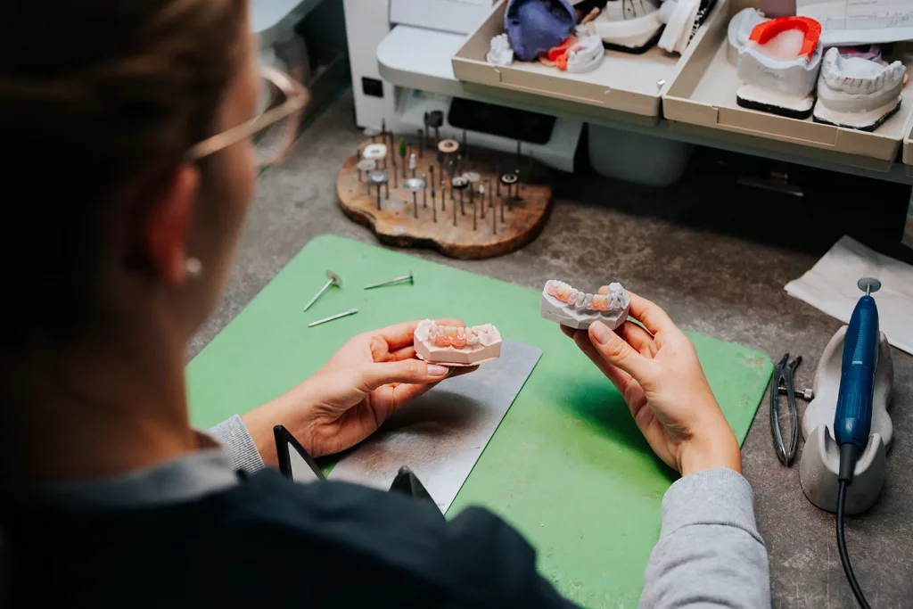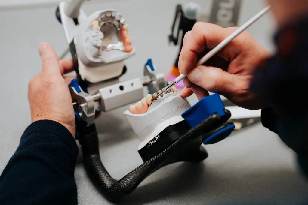 In unserer Kunststoffabteilung vereinen wir modernste Technologie mit handwerklichem Können. Hier entstehen passgenaue Aufbissschienen, flexible Teilprothesen (z. B. Valplast) und individuelle Kunststoffarbeiten, die höchsten ästhetischen und funktionellen Ansprüchen gerecht werden. Jeder Arbeitsschritt wird sorgfältig geplant und von erfahrenen Zahntechnikern präzise umgesetzt.